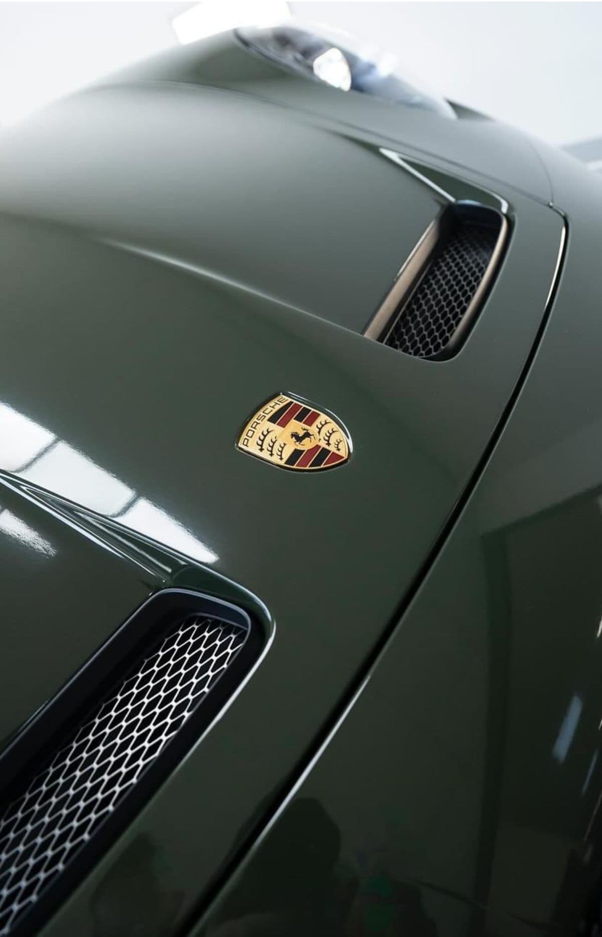 ポルシェケイマンGT4のボンネット、ルーフ、リアエンドまでのストライプ加工です。湾曲しているルーフなどに、正面より真っ直ぐに見えるように施工するのは、技術が必要です。
