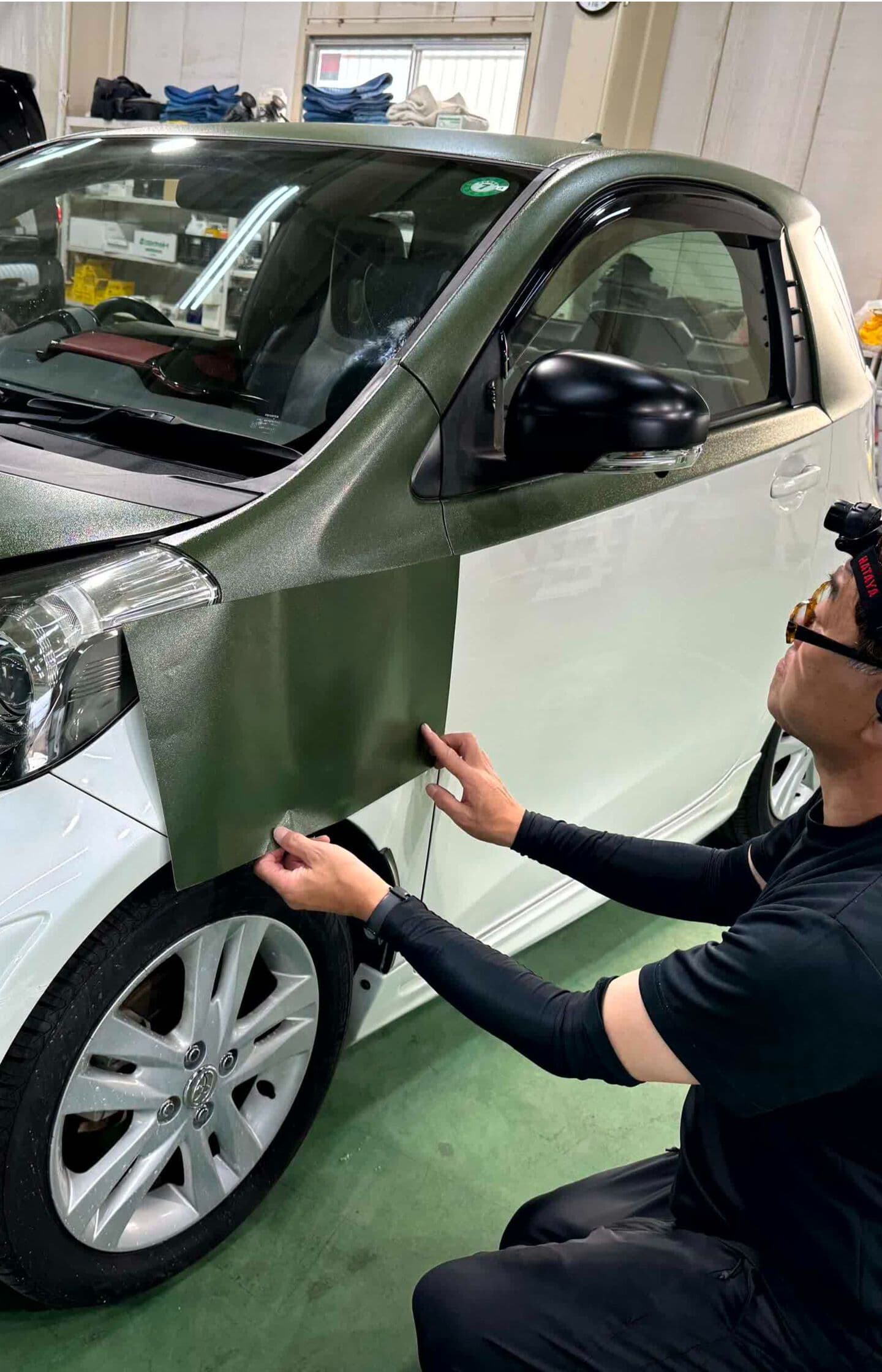 約80種以上のカラー、質感のフィルムで、ボディの部分的なところから、全体までカラーチェンジしてカスタマイズすることが出来ます。部分的なポイントラッピングでイメージチェンジしたり、ボディ全体を大胆にカラーチェンジしてイメージを変更することが出来ます。塗装をするのと違い、剥がせばもとに戻るのも特徴です。